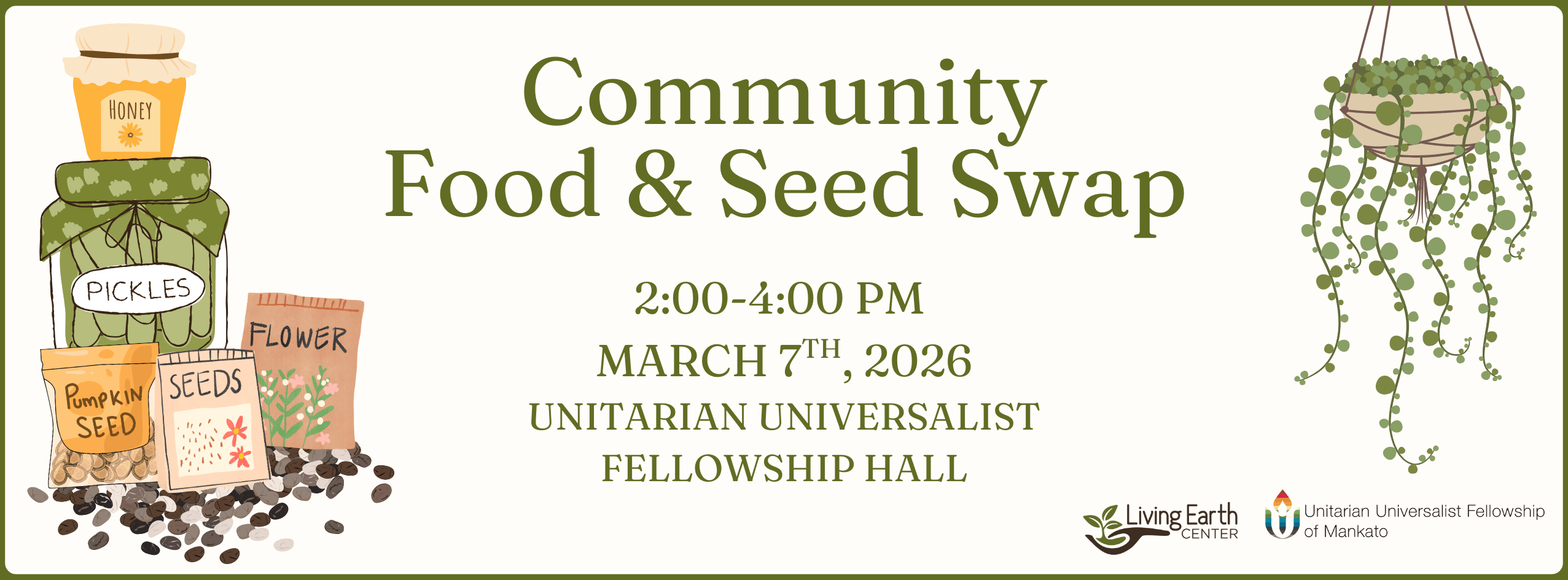 Please join us for a Community Seed and Food Swap Event on Saturday, March 7th, from 2 pm-4 pm at the Unitarian Universalist fellowship hall! We invite you to join other community members to gather together to share local homegrown food and to promote a resilient, connected community.
